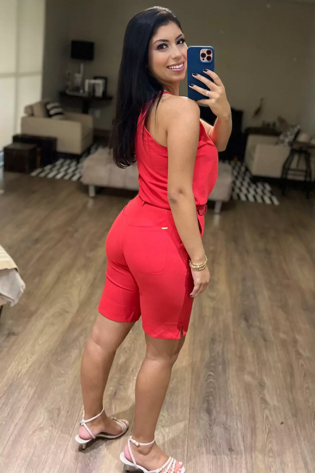 Conjunto bermuda sensoriale na cor flame, cós alto, bolsos traseiros, bolsos faca frontal e fecho frontal de zíper e colchetes. Acompanha cinto do mesmo tecido. Blusa Sensoriale flame, alça fina com fecho traseiro dourado. Um conjunto super elegante e charmoso e que proporciona várias combinações de looks.