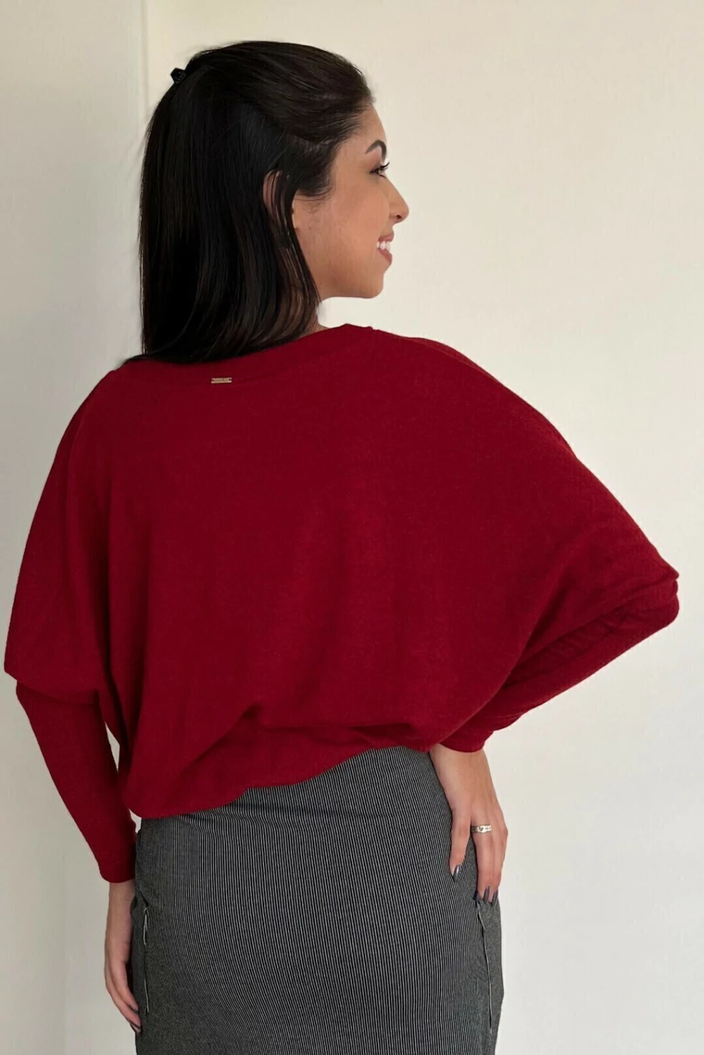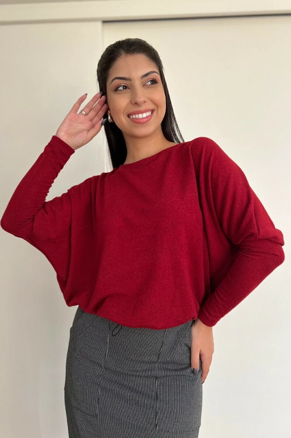 Blusa malha tricot vinho, decote redondo, mangas e punhos largos. Peça perfeita para aqueles dias que pedem todo charme e conforto.