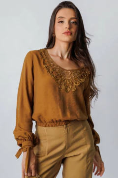 Blusa em tecido mix viscose e poliamida, na cor grapia, decote com renda na mesma cor frente e costas, manga com faixa para nó ou laço e elástico na barra para melhor ajuste ao corpo , Uma peça que proporciona charme e estilo na medida certa.