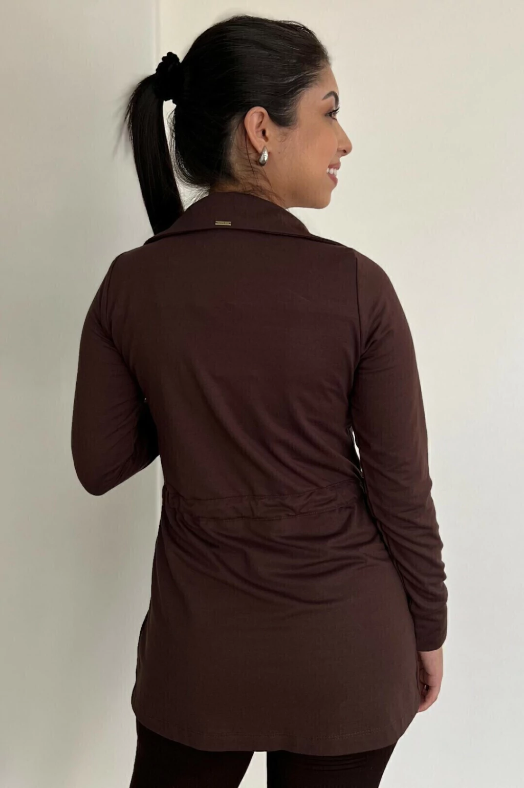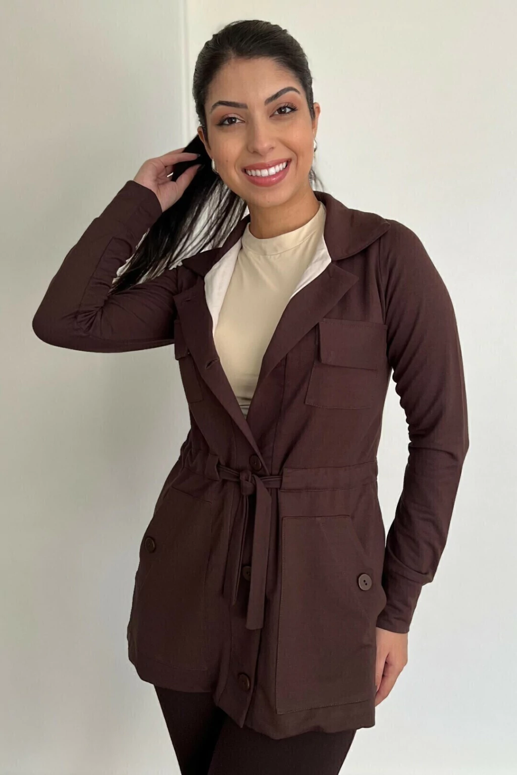 Parka moletinho na cor mascavo, forro frontal em off white, bolsos e botões frontais, manga com punho largo e cordão na cintura para melhor ajuste. Uma peça com estilo despojado e elegante.