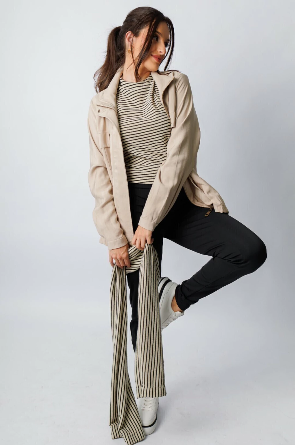 Blusa malha tricot marine listrado nas cores preto e homus, gola média, cava com detalhes em pespontos. Acompanha cachecol no mesmo tecido. Peça ideal para ser usada tanto sozinha, quanto por baixo de casacos.