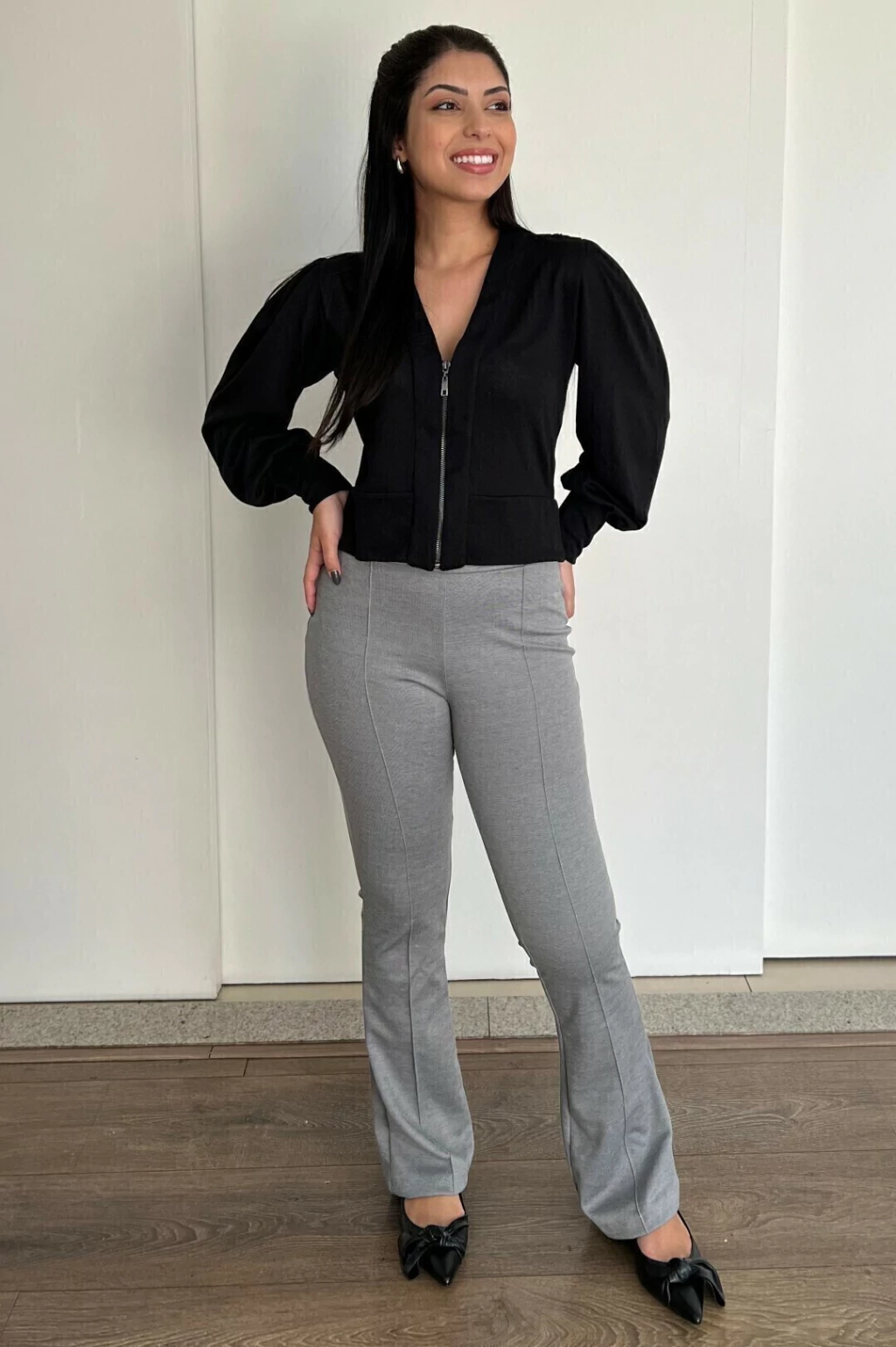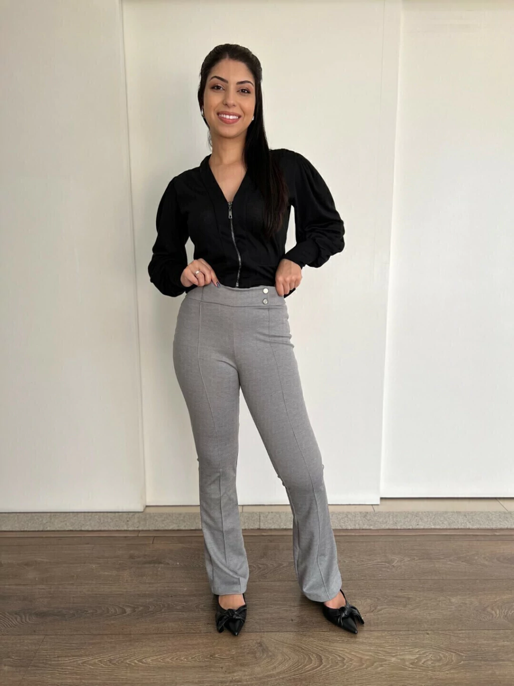 Calça na malha jacquard com elastano, na cor mescla, cós de elástico largo com detalhes em botões prata e modelagem justa ao corpo. Muito conforto em uma peça básica, mas muito elegante.