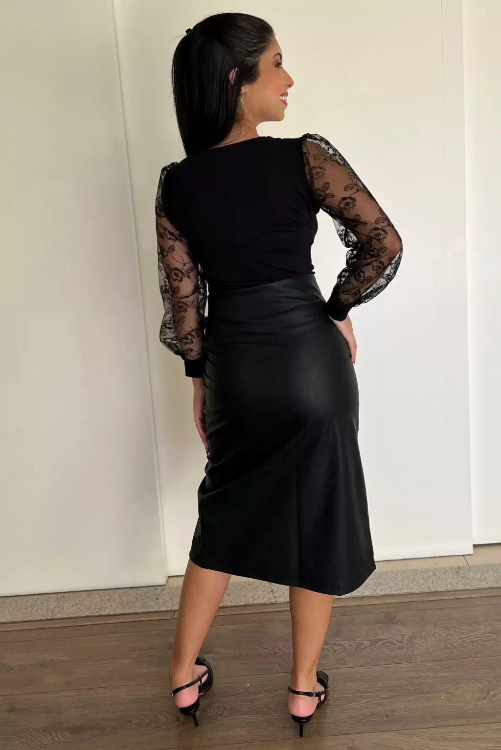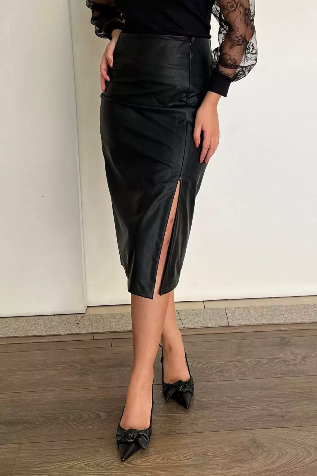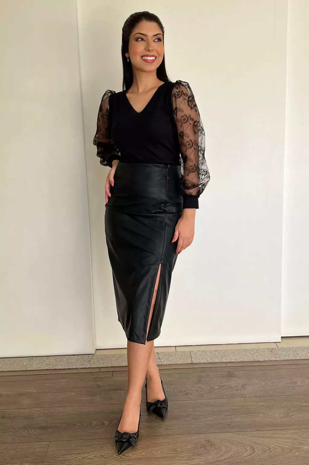 Saia midi leather (couro sintético) com elastano, na cor preta, fecho frontal de zíper e fenda frontal ajustável também por zíper. Uma peça que além do conforto, proporciona muito estilo e elegância.