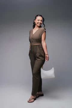 O macacão Surface em tom terroso é a escolha perfeita para quem valoriza elegância e praticidade. Com decote em V, fechamento frontal por botões e faixa para amarrar na cintura, ele modela a silhueta com charme. A calça oferece conforto e liberdade de movimento, ideal para diversas ocasiões. Confeccionado em tecido leve, combina com sandálias de salto ou rasteirinhas para um visual versátil e atemporal.