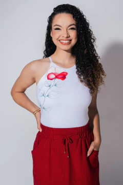 Destaque-se com esta blusa exclusiva, uma verdadeira obra de arte vestível. Confeccionada em tecido de alta qualidade, ela oferece um ajuste confortável e suave ao corpo. O diferencial fica por conta da pintura à mão de uma flor vibrante, que confere um toque artístico e único à peça. Com um design de gola halter que valoriza os ombros, esta blusa é perfeita para criar looks modernos e cheios de personalidade.