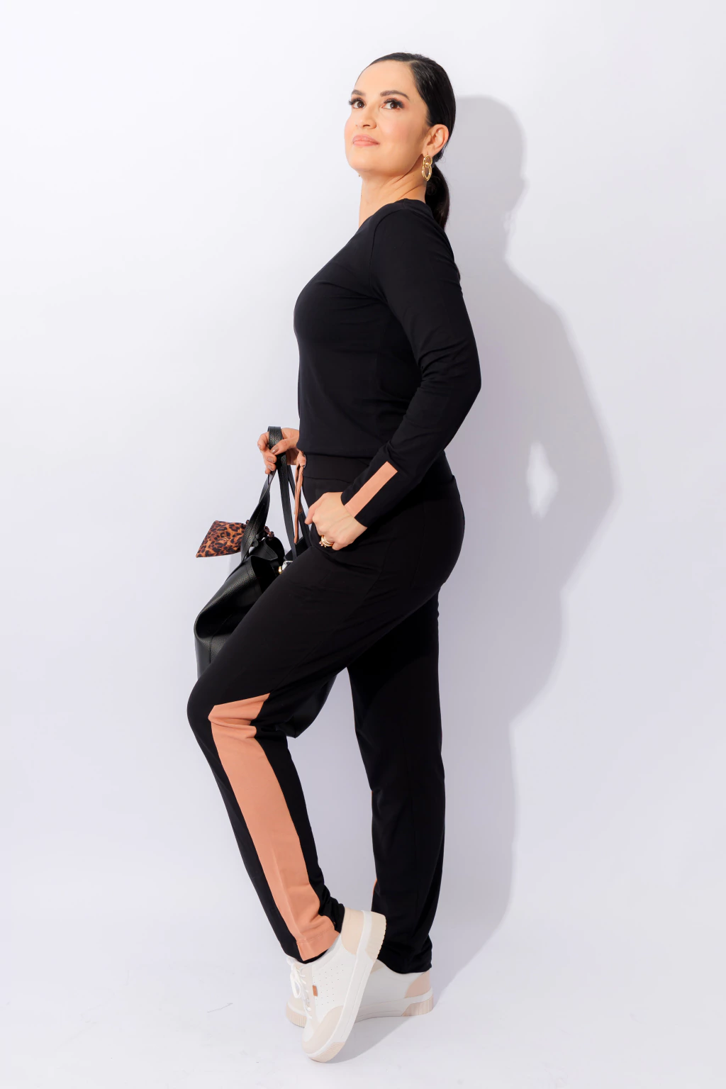 Experimente o encontro perfeito entre conforto e estilo com este conjunto moderno e elegante, ideal para o dia a dia. Composto por blusa de manga longa e calça jogger em preto clássico, destaca-se pelos detalhes em faixas verticais e horizontais em tom salmão, que conferem sofisticação. A calça possui cós com cordão salmão, garantindo ajuste confortável e personalizado. Versatilidade para ocasiões diversas com um toque refinado.