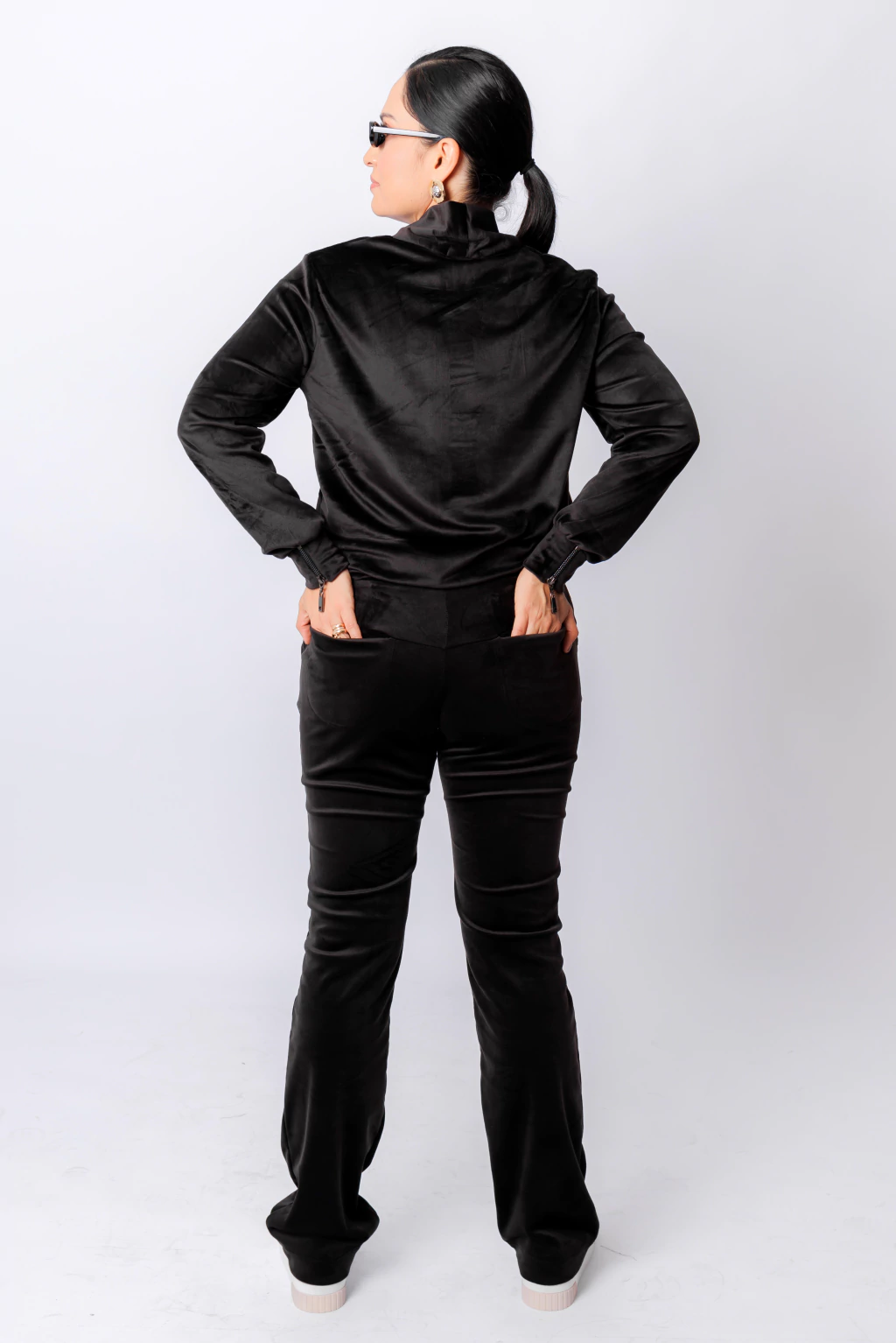 Este conjunto elegante e confortável é confeccionado em um tecido de veludo preto com toque macio, ideal para um visual sofisticado e aconchegante. A blusa de manga longa possui gola alta e um zíper frontal que se estende até o busto, permitindo ajuste no decote. A calça, com corte reto e caimento impecável, complementa a blusa para criar um look coeso e versátil. Perfeito para o dia a dia com um toque de luxo ou para eventos casuais que pedem estilo e conforto.