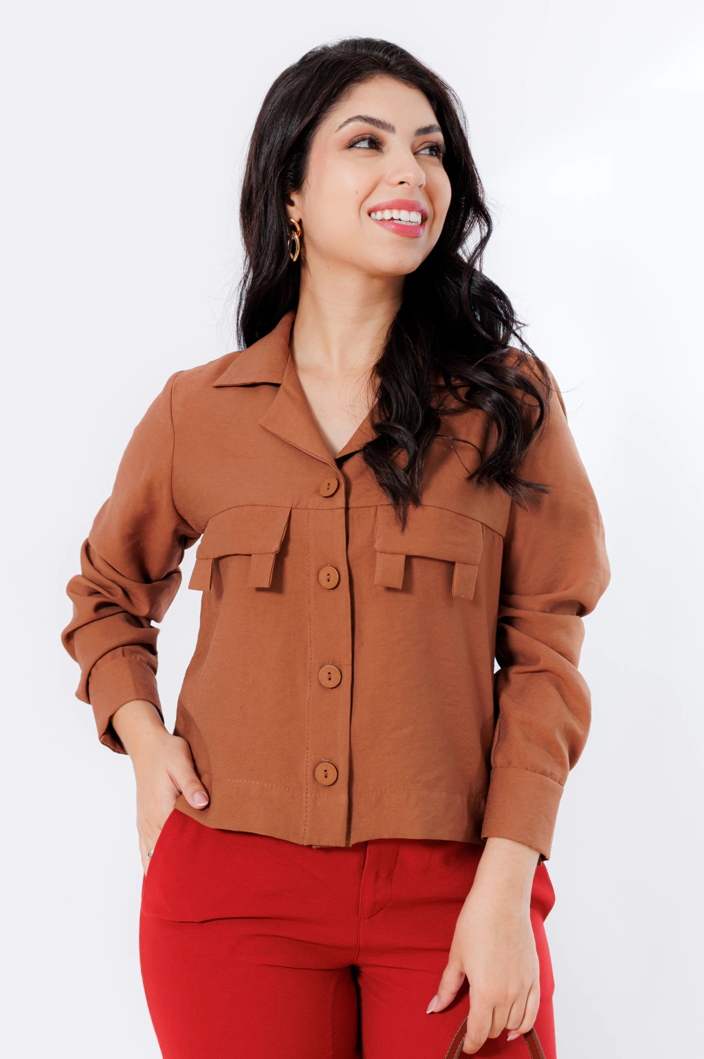 Jaqueta Sensoriale marrom com mangas longas e punhos simples, perfeita para compor looks elegantes e versáteis. Possui gola clássica e fechamento frontal com botões, garantindo praticidade e estilo. Na altura do busto, conta com dois bolsos com lapelas decorativas que adicionam charme à peça. O corte reto e o tecido de textura sutil proporcionam conforto e acabamento sofisticado para o dia a dia.
