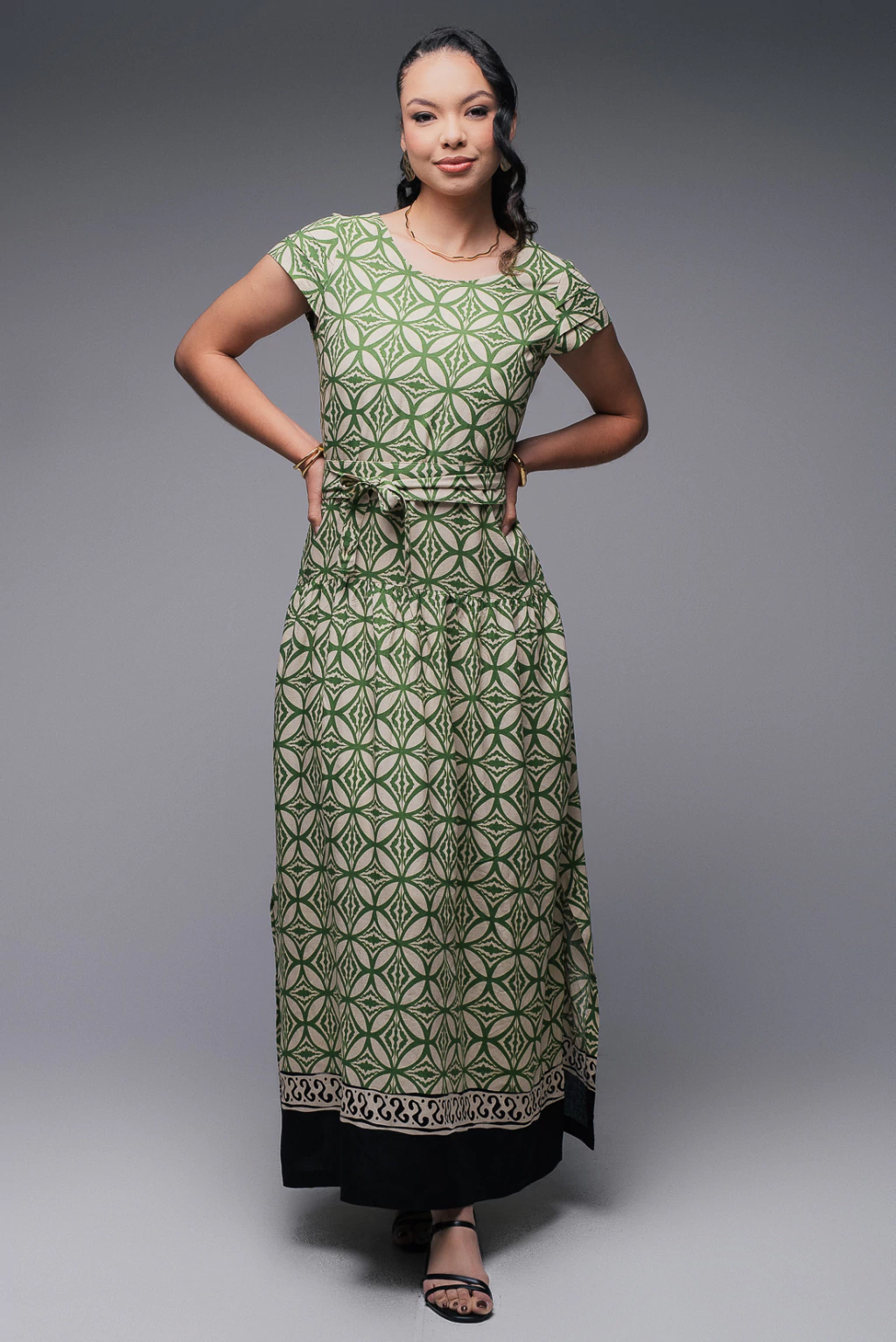 Elegância e conforto se encontram neste vestido longo estampado que exala estilo e personalidade. Com um padrão geométrico em tons de verde e bege, a peça apresenta mangas curtas e um decote redondo que se ajusta com leveza. A faixa para amarrar na cintura modela a silhueta, enquanto a saia ampla e fluida proporciona movimento e um caimento impecável. O detalhe na barra em preto com estampa delicada adiciona um toque de sofisticação e contrasta de forma harmoniosa. Versátil, este vestido é ideal para um passeio no fim de semana ou para um evento especial.